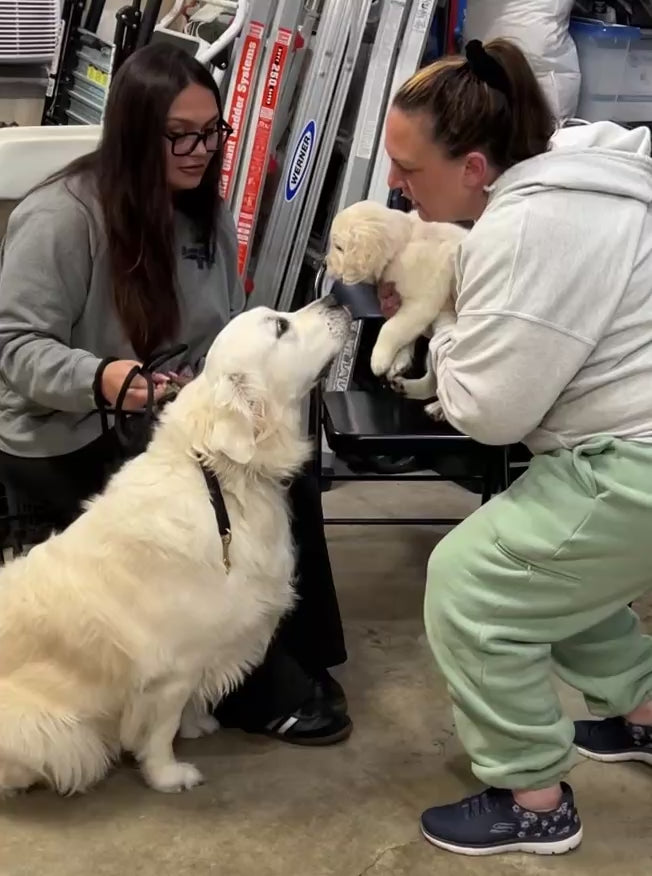 The new puppy comes from a breeder specializing in service and therapy dogs (Golden Bliss) so she's already being put through exercises and scenarios to build confidence, patience and manners.